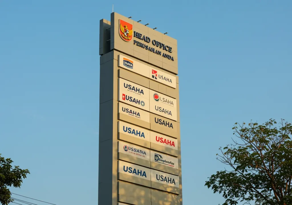 Pylon sign dengan tampilan multi-brand, menampilkan nama beberapa tenant atau unit usaha dalam satu gedung atau komplek. Cocok untuk perkantoran, ruko, pusat bisnis, dan kawasan komersial terpadu.